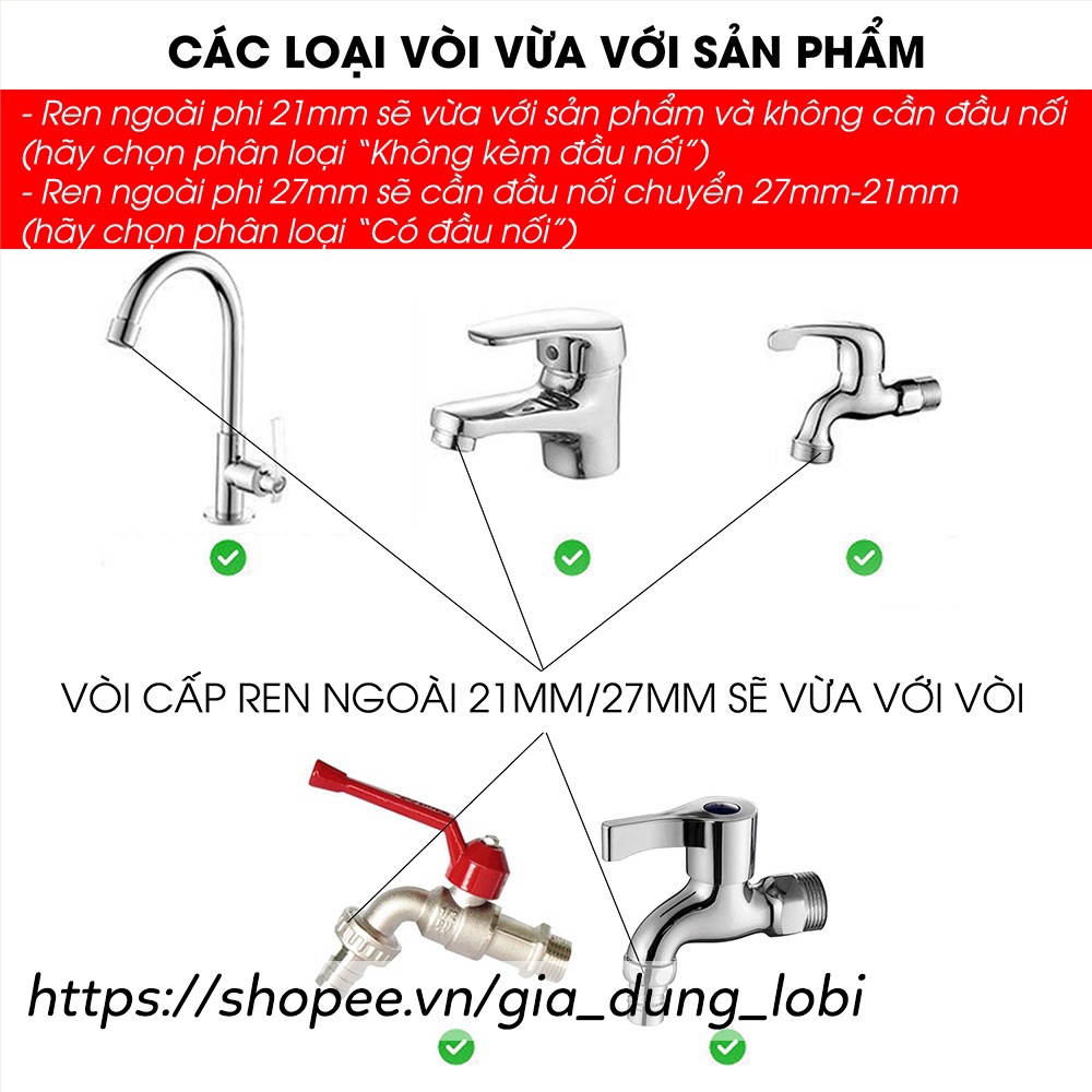 - Phân loại có đầu nối là đầu nối nối vòi cấp nước có ren ngoài là 27mm sang 21mm để lắp vừa với ống