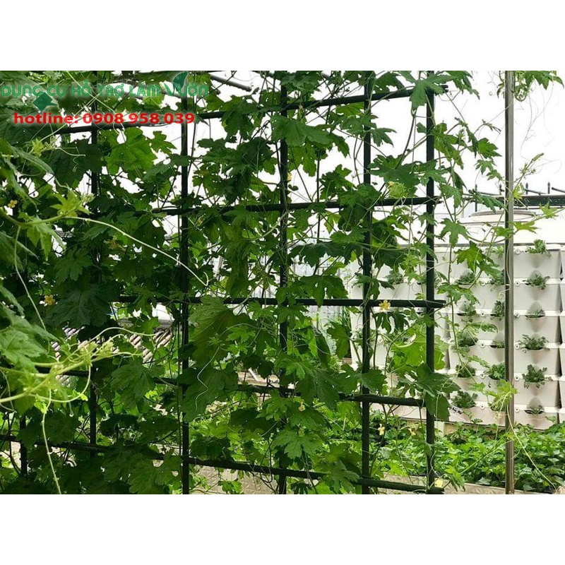 6/ Dùng thêm lưới ô vuông 10*10cm, dây rút màu xanh lá cột lưới vào giàn cho đẹp tông màu vườn