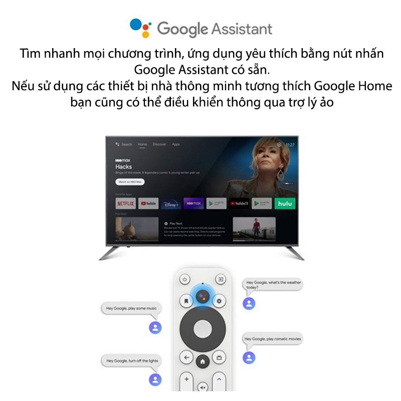onn. Android TV tương thích với Google Home nên bạn có thể điều khiển và trình chiếu nội dung chỉ bằng giọng nói, như “Ok Google, play Stranger Things from Netflix on my living room TV.”