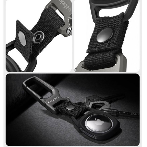 Ốp Airtag chống sốc chính hãng Spigen, thiết ké chắc chắn chống va đập, kết hợp sợi carbon và thép không rỉ rất đẹp, quai móc kiêm mở nắp chai