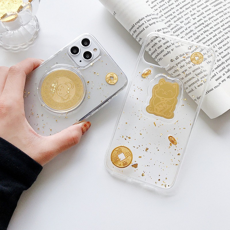 - Họa tiết mèo, đồng vàng, đồng xu được ép liền với ốp
