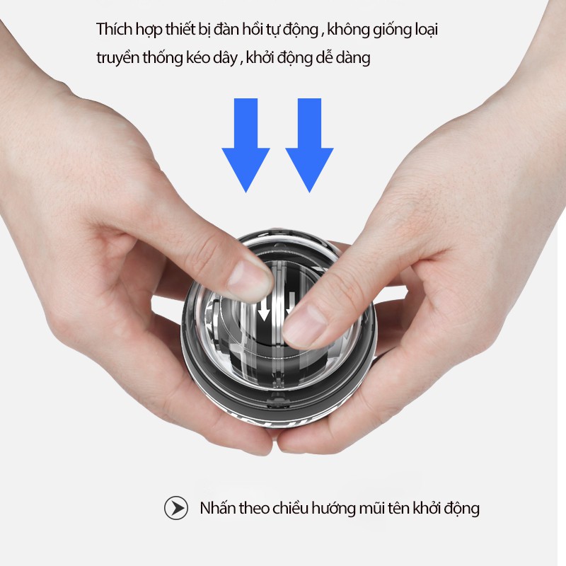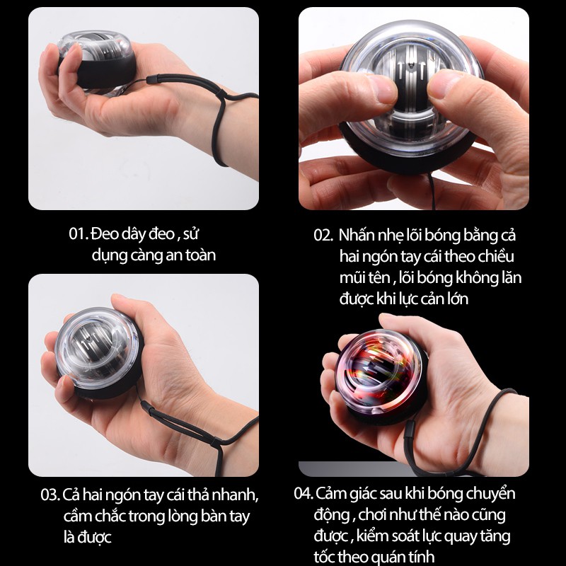 Cách sử dụng Bóng tập cổ tay : Khi trong quá trình hoạt động, người dùng chỉ cần đẩy theo chiều mũi tên, động cơ sẽ tự động quay và tạo ra lực khoảng 14kg (tương đương 8000 vòng / phút) và lực 22kg (tương đương 10000 vòng / phút). Sau đó, người dùng có thể xoay cổ tay hoặc lên xuống khi cần
