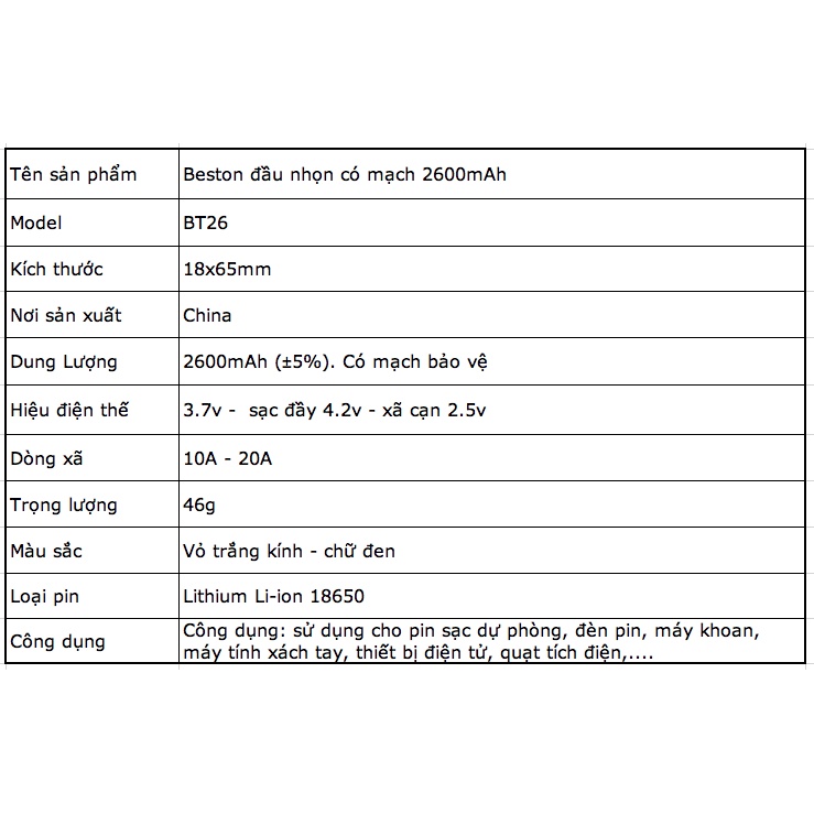 Thiết Bị Điện Gia Dụng > Pin || [P37] Pin sạc 18650 Beston đầu nhọn 2600mah Chính hãng chuyên cho đèn pin, đèn công suất lớn, đèn siêu sángCòn hàng
