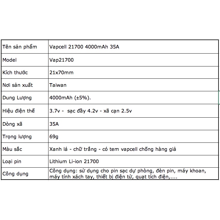 Màu sắc: Màu xanh lá cây chữ đen - có tem chống hàng giả vapcell