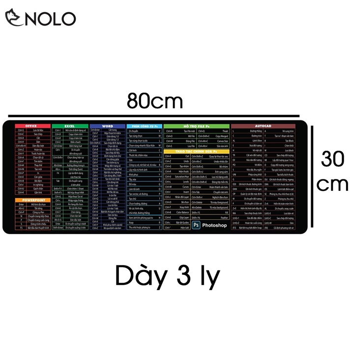 Lót Chuột Lớn Kích Thước 30x80cm Dày 3 Ly Bề Mặt In 3D Không Phai 175 Phím Tắt Lệnh Của Office, Word, Photoshop