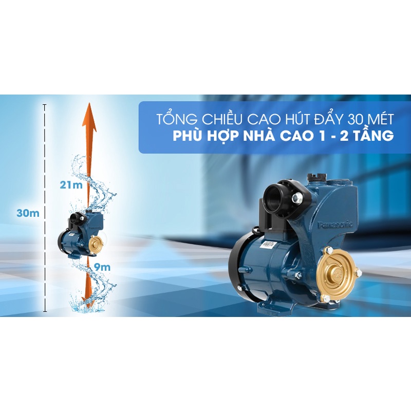 - Máy bơm nước Panasonic có độ cao đẩy tối đa 21M, Chiều sâu hút lên tới 9M bảo đảm gia đình bạn luôn đủ nước để sinh hoạt.