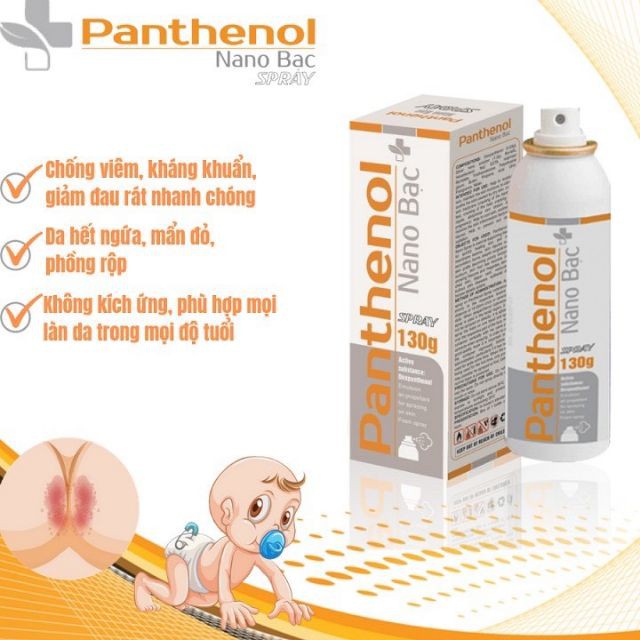🏅🏅🏅Thành phần: Trong 100g chế phẩm chứa: Dexpanthenol (4,63g), dung dịch Nano bạc (1,0g), Acid Myristic, Hexadecanol, Na2 EDTA, Isopropyl Myristate, triethenolamine, Polyethy-ene glycol, Butan, Propane, Acid citric, Frangrance, Water.Mục đích sử dụng: Giúp dưỡng da, duy trì độ ẩm cho da, làm giảm rát da, khô da, nứt nẻ rạn da (nứt da chân, tay, nứt nẻ gót chân, nứt đầu vú, rạn da bụng do mang thai…) Giúp làm mát da, dịu da, săn se da, làm giảm các tác nhân gây viêm nhiễm da khi bị tổn thương. Giúp ngăn ngừa tổn thương da do ánh nắng mặt trời, do bức xạ.