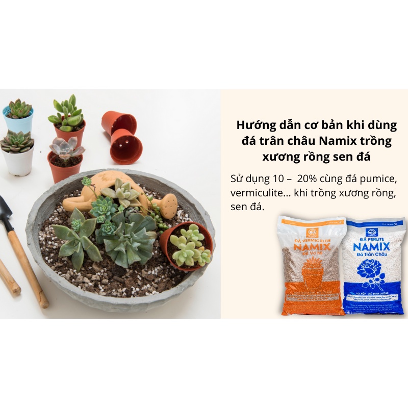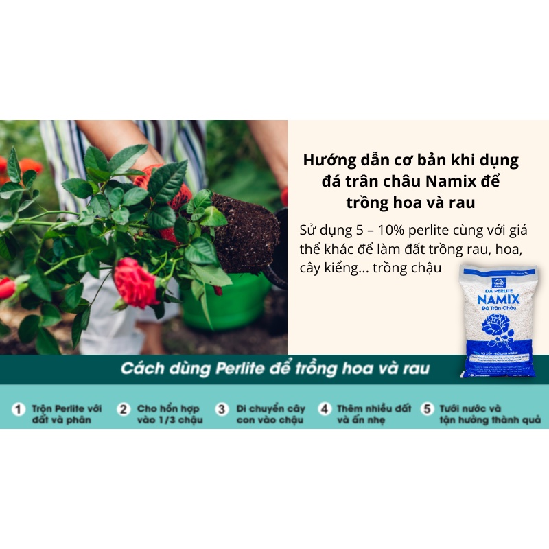 Đá perlite Namix chuyên dùng để trồng hoặc trộn giá thể trồng cây: Hoa hồng, xương rồng, sen đá, hoa lan, trồng rau thuỷ canh và trồng rau mầm.Với cấu trúc thể hang nên nó có thể ngậm nước, chất dinh dưỡng, điều hòa nhiệt độ, độ ẩm cho đất, giá thể trồng. Giúp cho đất, giá thể tơi xốp thoáng khí giúp cho bộ rễ phát triển mạnh, thích hợp để trồng hoa, trồng lan, trồng hoa hồng, hoa sen đá….