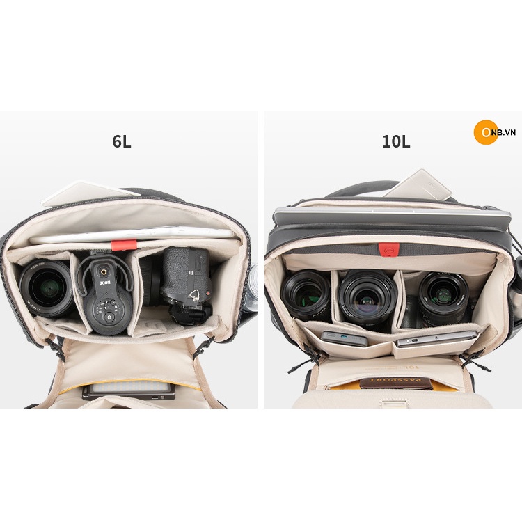 Với túi 6L: 1 body 1 lens, 1flash, phụ kiện ... hay 1 body flycam mini 2 và pin, sạc ... thêm 1 ngăn đựng máy ipad