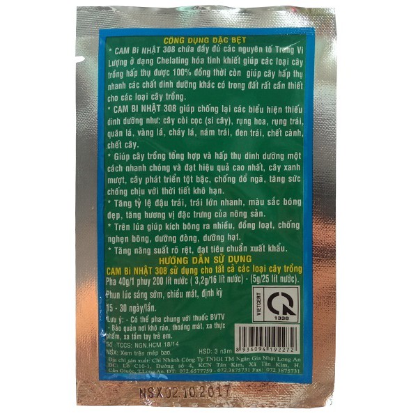 CAM BI NHẬT 308 chứa đầy đủ các nguyên tố Trung Vi Lượng ở dạng Chelating hoá tinh khiết giúp các loại cây trồng hấp thụ được 100% đồng thời còn giúp cây hấp thụ nhanh các chất dinh dưỡng khác có trong đất rất cần thiết cho các lao5i cây trồng.