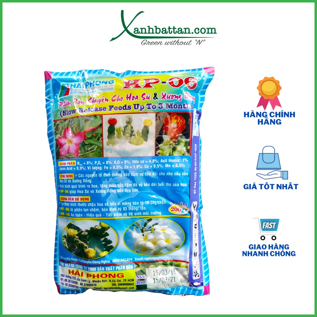 Với thành phần dinh dưỡng đặc biệt, bao gồm khoáng NPK và các chất hữu cơ cùng acid humic với tỉ lệ cân đối. Phân bón HP 06 được dùng chuyên cho cây hoa sứ và cây xương rồng, giúp cây sinh trưởng và phát triển. Bên cạnh đó, không gây ra hiện tượng sốc phân (xót phân bón) cho cây.