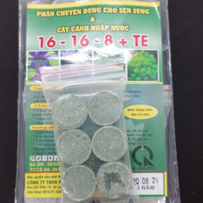 Phân bón chuyên dùng cho sen súng và cây cảnh ngập nước tỷ lệ NPK 16 - 16 - 8 + te. Cung cấp đầy đủ dưỡng chất và cân bằng dưỡng chất cho cây thủy sinh phát triển một cách cân bằng và mạnh mẽ. Phân cũng có thể dùng cho các loại cây trồng như xương rồng, cây xứ và các loại cây mỏng nước khác như sen đá bằng cách vùi viên phân xuống giá thể.Qui cách: gói 24 viên
