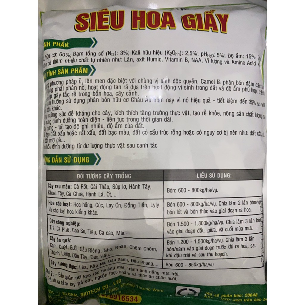 - HDSD : Bón trực tiếp xung quanh tán cây , bón 10-15g/cây (đối với cây nhỏ), bón 20-25g/cây (đối với cây to)