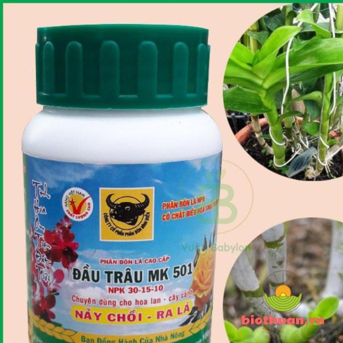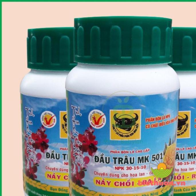 Phân bón đầu trâu 501 phân bón lá phun trực tiếp vào lá và thân cây cung cấp cho cây trồng đạm, khoáng chất giúp hoa lan cây cảnh đâm chồi, nảy lộc nhanh và dễ dàng ra lá. Đâu là một dạng phân NPK tổng hợp cứ trong 100gr có 30gr N, 15gr lân và 10gr kali. Với hàm lượng đạm cao giúp cây trồng ra nhiều lá và quả hơn.
