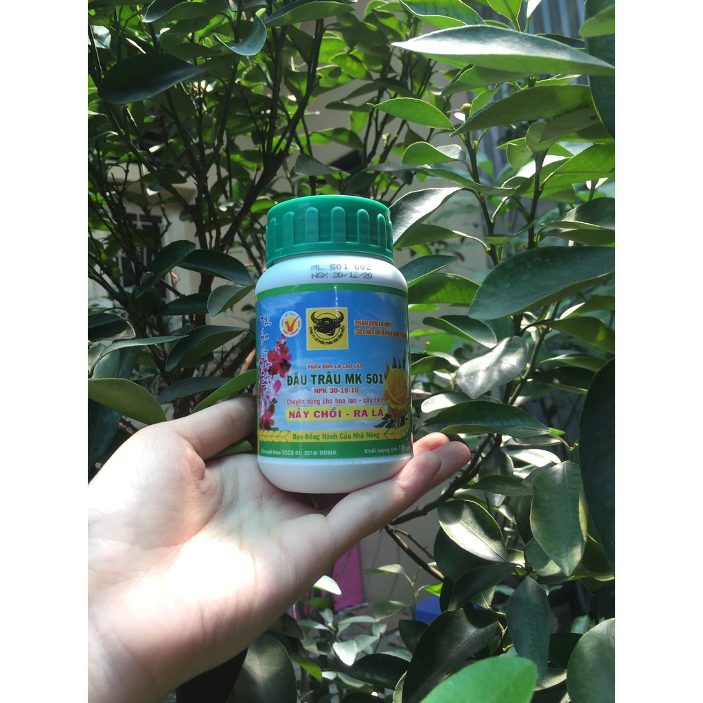 Phân Bón Lá Đầu Trâu 501Phân bón đầu trâu 501 phân bón lá phun trực tiếp vào lá và thân cây cung cấp cho cây trồng đạm, khoáng chất giúp hoa lan cây cảnh đâm chồi, nảy lộc nhanh và dễ dàng ra lá. Đâu là một dạng phân NPK tổng hợp cứ trong 100gr có 30gr N, 15gr lân và 10gr kali. Với hàm lượng đạm cao giúp cây trồng ra nhiều lá và quả hơn.
