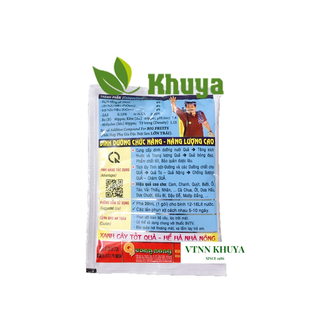 * Thành phần: N: 6%; P2O5: 6%; K2O: 6%, Bo: 90ppm, Zn: 60ppm và Mo: 80ppm. pH: 7.4, tỷ trọng 1.15, phức hợp phụ gia đặc biệt làm lớn trái