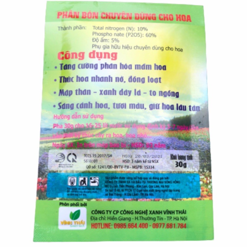 Thành phần: N:10%, P2O5:60% và phụ gia đặc biệt dành cho hoa.