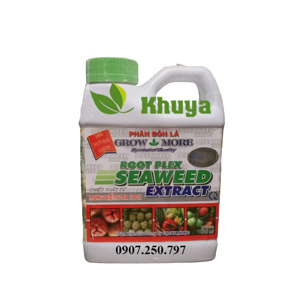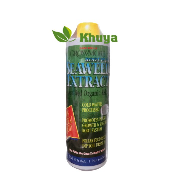 - Chai nắp vàng 473ml (Growmore Root Plex Seaweed Extract): P2O5: 1%, Fe: 30.000ppm, Kẽm(Zn): 500ppm, pH: 3, tỷ trọng: 1.09
