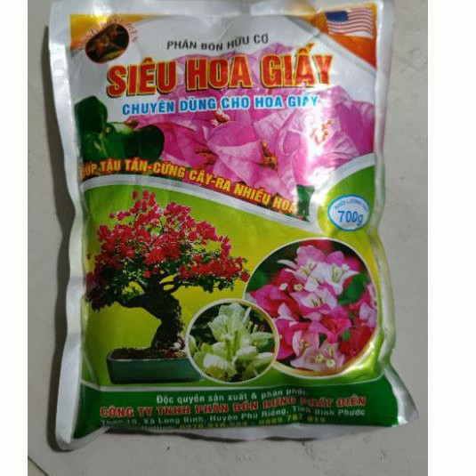 Phân bón hữu cơ SIÊU HOA GIẤY giúp tán cứng cáp, ra hoa nhiềuSiêu hoa giấy là phân bón hữu cơ được sản xuất trên dây truyền công nghệ hiện đại,, kết hợp đủ các chất hữu cơ NPK, ACIS HUMIC, VITAMIN B1, CÁC AMINO VÀ KHOÀNG TRUNG VI LƯỢNG