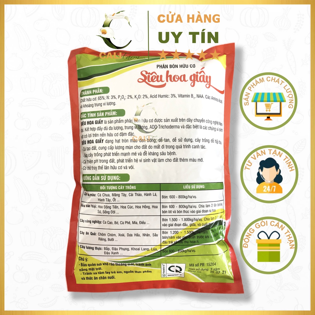 🌺 HDSD : Bón trực tiếp xung quanh tán cây , bón 10-15g/cây (đối với cây nhỏ), bón 20-25g/cây (đối với cây to)
