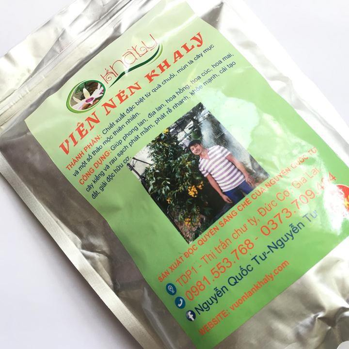 Phân bón hữu cơ vi sinh dạng viên nén Khaly túi 1kg tốt cho mọi cây trồngTHành phần: Chiết xuất đặc biệt từ quả chuối, mùn lá cây mục và một số thảo mộc thiên nhiên.