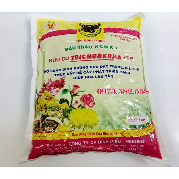 Phân bón hữu cơ vi sinh Đầu Trâu HCMK 7 Bokashi TrichodermaPhân bón hữu cơ vi sinh Đầu Trâu HCMK 7 Bokashi Trichoderma được sản xuất bởi công ty cổ phân Bình Điện với công nghệ tiên tiến. Phân dược sản xuất bằng các loại rác thải hữu cơ được bổ siung các vi sinh vật có lợi, đặc biệt là Nấm đối kháng Trichoderma. Ngoài ra phân còn được bổ sung các chất vi lượng cần thiết cho cây trồng.\