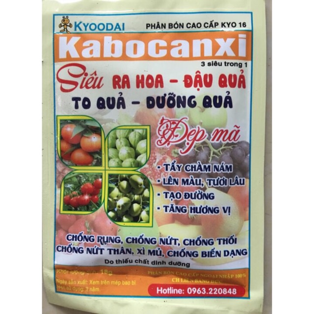 - 1 gói phân bón kabocanxi dùng cho 1 bình 16-20 lít nước- kabocanxi là dạng phân bón lá, cung cấp chất dinh dưỡng hỗ trợ cây trong quá trình ra hoa, giúp hoa ra nhiều, đậu quả, to quả, dưỡng quả, đẹp mã