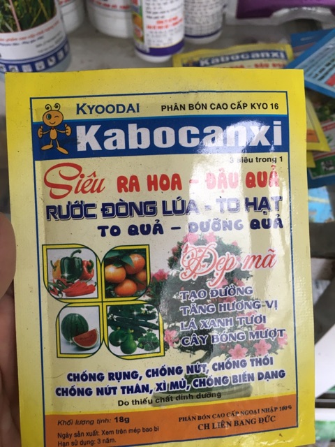 - 1 gói phân bón kabocanxi dùng cho 1 bình 16-20 lít nước- kabocanxi là dạng phân bón lá, cung cấp chất dinh dưỡng hỗ trợ cây trong quá trình ra hoa, giúp hoa ra nhiều, đậu quả, to quả, dưỡng quả, đẹp mã