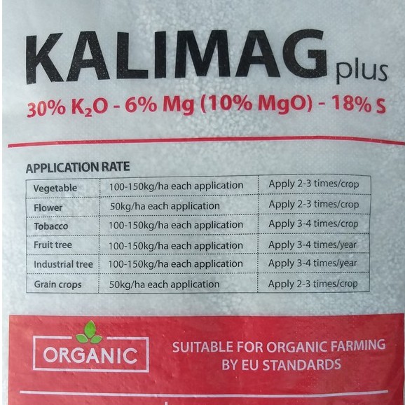 Phân bón KALIMAG nhập khẩu CHLB Đức được làm từ 100% Kali SOP (kali trắng tinh khiết) giúp cây trồng xanh lá, dày lá, to củ, chắc hạt, lớn trái, chống sượng trái.