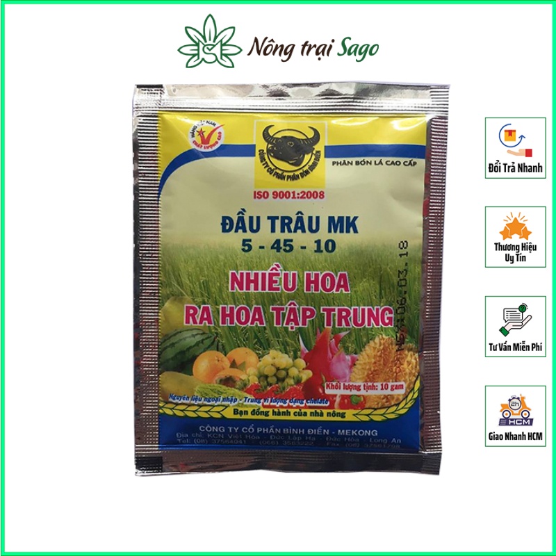 Giới thiệu Phân Bón Kích Ra Hoa Tập Trung, Đậu Trái - Hiệu Đầu Trâu NPK 5-45-10 (Gói 10gram) - Nông Trại Sago