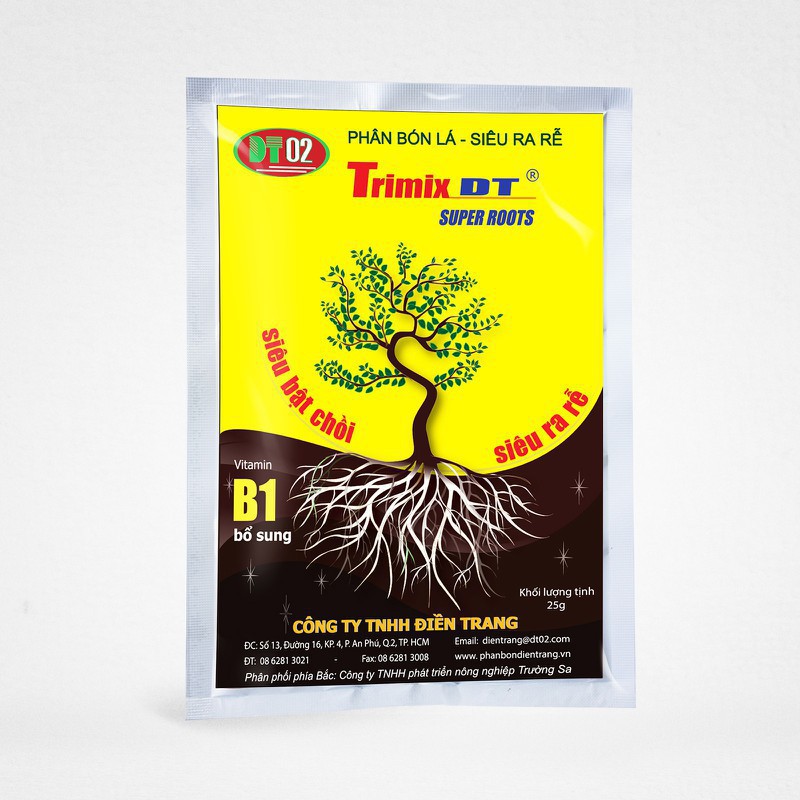 Phân bón SIÊU RA RỄ TRIMIX-DT có bổ sung Vitamin B1, chất điều hòa sinh trưởng GA3 và NAA giúp cây trồng phát triển rễ mạnh, kích thích tăng trưởng, ra tược mạnh, chống rụng hoa và tăng khả năng đậu trái.