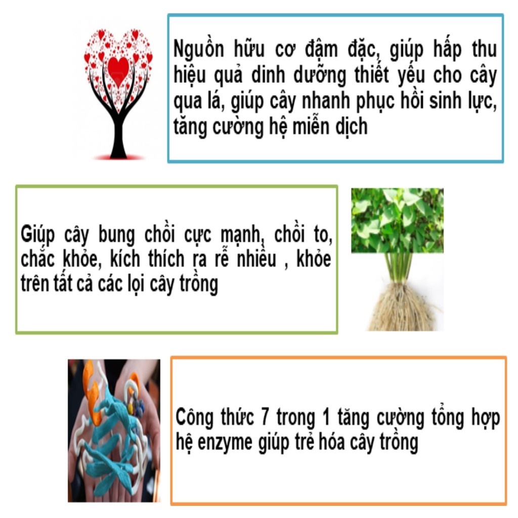 Nguồn hữu cơ đậm đặc, giúp hấp thu hiệu quả dinh dưỡng thiết yếu cho cây qua lá, giúp cây nhanh phục hồi sinh lực, tăng cường hệ miễn dịch