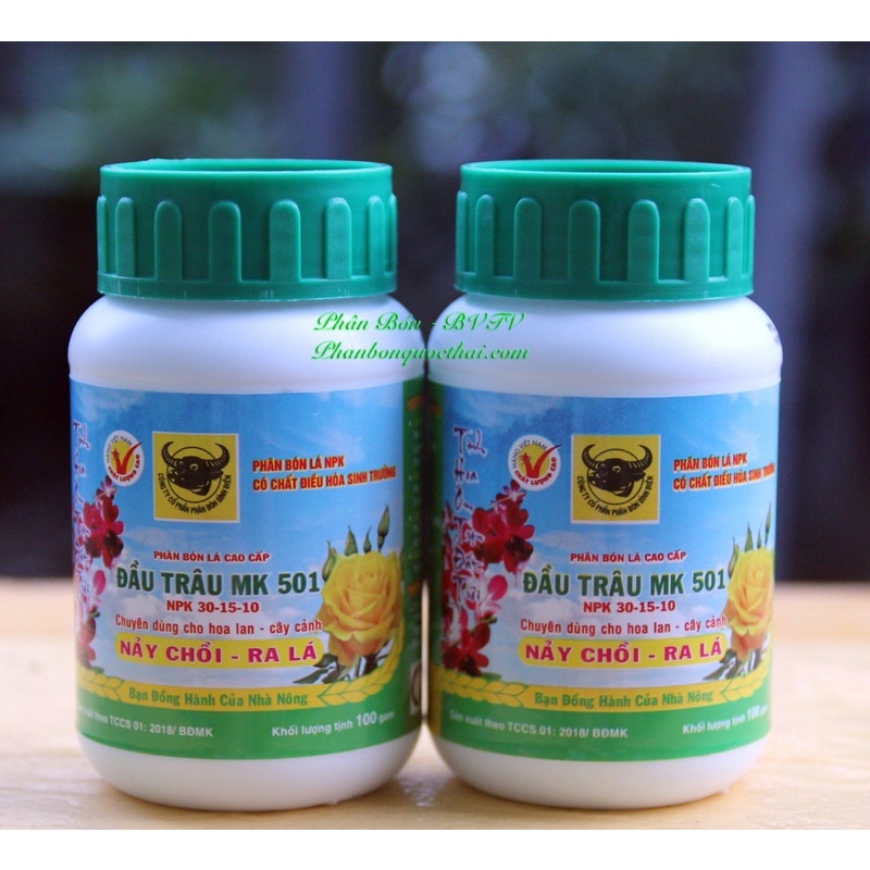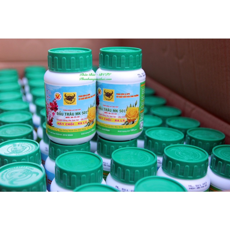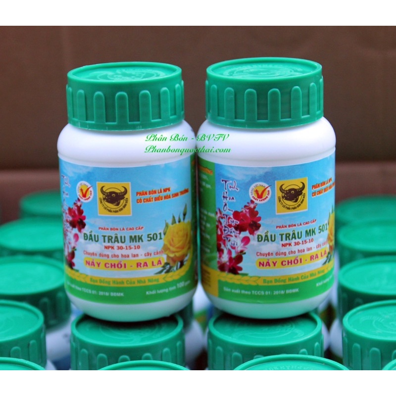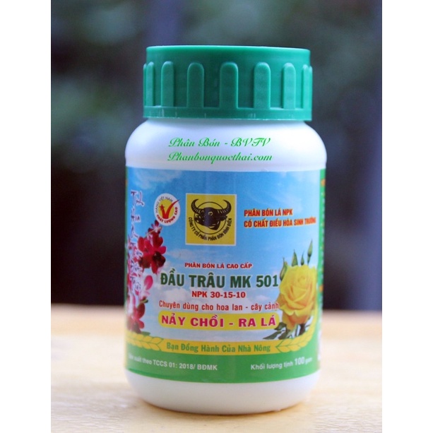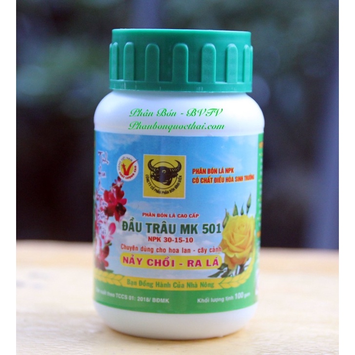 Phân Bón Lá Đầu Trâu 501,bổ sung Ga3 điều hòa sinh trưởngPhân bón đầu trâu 501 phân bón lá phun trực tiếp vào lá và thân cây cung cấp cho cây trồng đạm, khoáng chất giúp hoa lan cây cảnh đâm chồi, nảy lộc nhanh và dễ dàng ra lá. Đâu là một dạng phân NPK tổng hợp cứ trong 100gr có 30gr N, 15gr lân và 10gr kali. Với hàm lượng đạm cao giúp cây trồng ra nhiều lá và quả hơn.