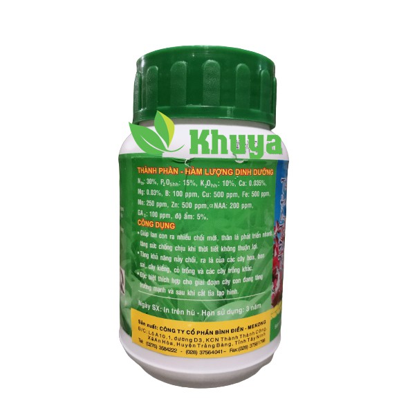 Thành phần: N: 30 %, P2O5: 15 %, K2O: 10 %, CaO: 0.035 %, Mg: 0.03 %, B: 100ppm, Cu: 500ppm, Fe: 500ppm, Mn: 250ppm, Zn: 500ppm, Alpha NAA: 200 ppm, GA3: 100 ppm, độ ẩm: 5%