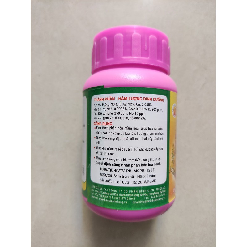 Công dụng: Kích thích phân hóa mầm hoa, giúp hoa ra sớm, nhiều hoa, hoa đẹp và lâu tàn, hương thơm tự nhiên. Tăng khả năng đậu quả với các loại cây cảnh có trái . Tăng khả năng ra rễ đặc biệt tốt cho dưỡng cây sau khi cắt tỉa cành. Tăng sức chịu đựng khi thời tiết không thuận lợi. Chuyên dùng cho Hoa Lan, Hoa Hồng và cây cảnh