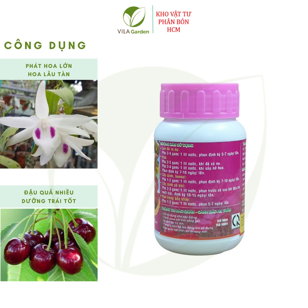 * Thành phần: N: 15 %, P2O5: 20 %, K2O: 25 %, CaO: 0.05 %, MgO: 0.05 %, TE (B, Cu, Fe, Mn, Zn): 2200 ppm, NAA: 200 ppm, GA3: 100 ppm.