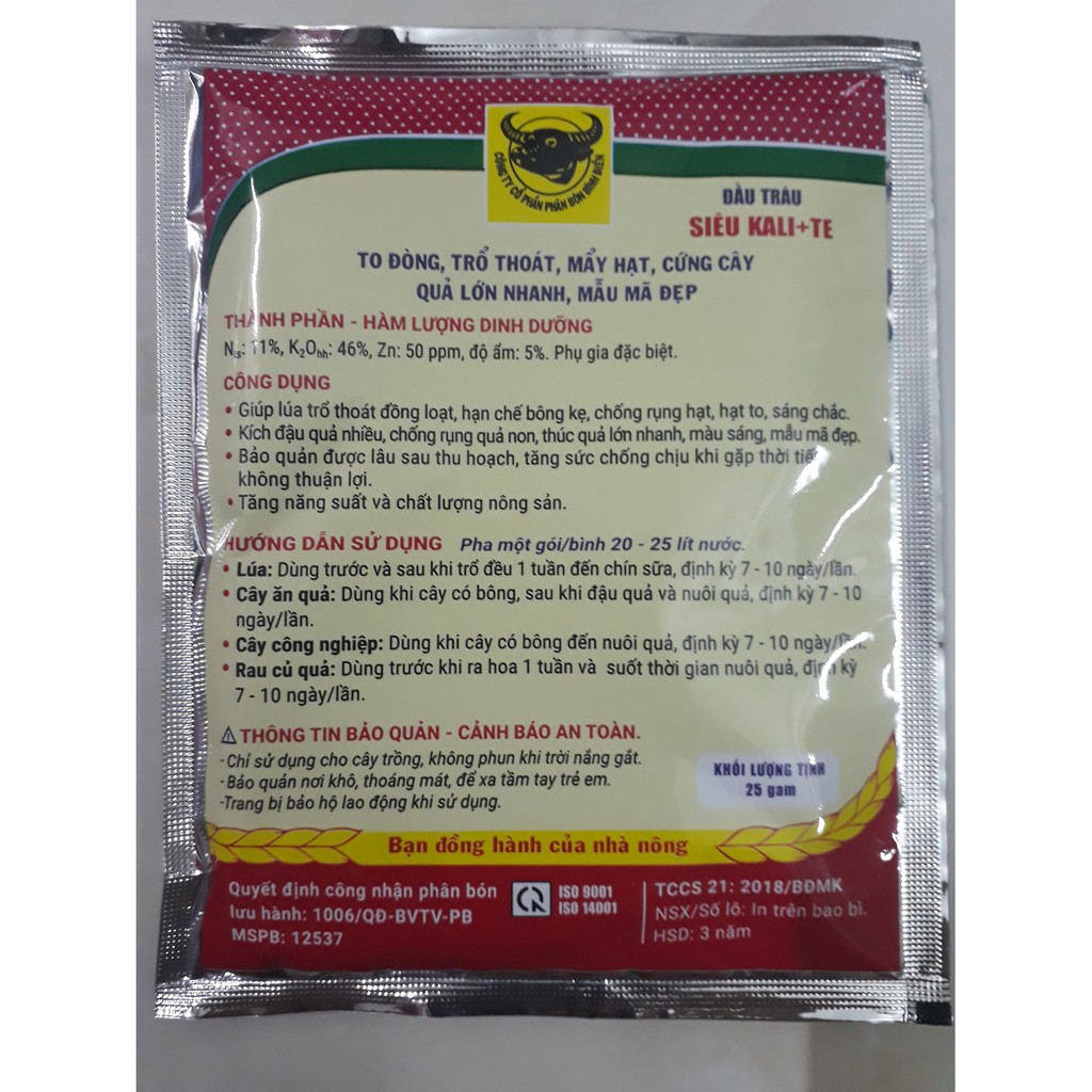Thành phần: Nts 11 %; K2Ohh 46%; Zn 50 ppm; Độ ẩm: 5% và Phụ gia đặc biệtCông dụng: Giúp lúa trỗ thoát đồng loạt, hạn chế bông kẹ, chống rụng hạt, hạt to, sáng chắc. Kích đậu quả nhiều, chống rụng quả non, thúc quả lớn nhanh, màu sáng, mẫu mã đẹp. Bảo quản được lâu sau thu hoạch, tăng sức chống chịu khi gặp thời tiết bất lợi. Tăng năng suất và chất lượng nông sản.