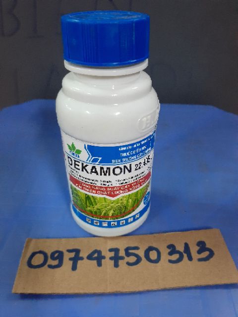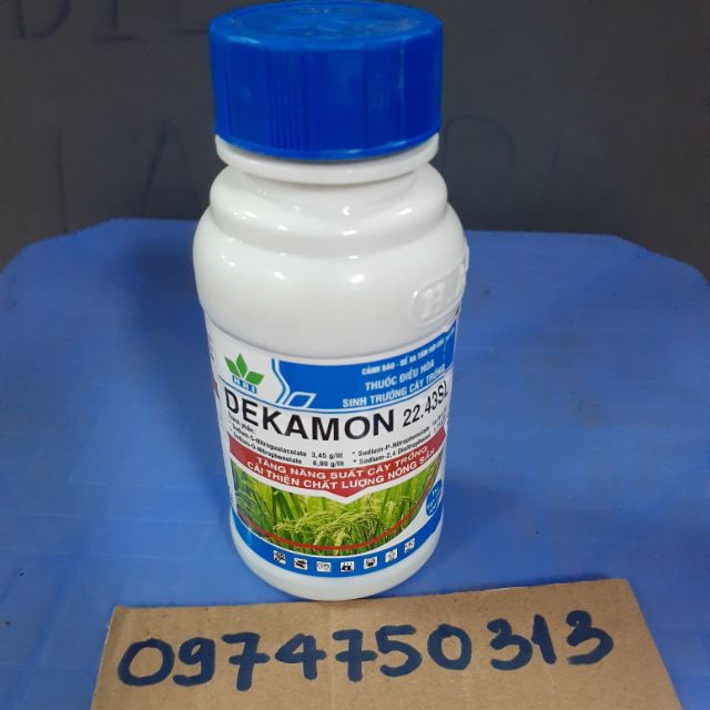 uốc kích thích sinh trưởng cây trồng Dekamon 22,43L chai 100ml Dekamon 22,43L kích thích cây trồng nảy mầm nhanh, ra rễ nhiều, đặc biệt giúp rễ lúa phát triển mạnh trên đất nhiễm phèn. Dekamon 22,43L kích thích cây trồng phát triển thân, chồi, lá... - Dekamon 22,43L kích cây trồng ra hoa, ra hoa đồng loạt, tăng đậu trái, hạn chế rụng trái non, - Dekamon 22,43L làm chắc hạt chắc lúa, bắp, đậu; cây ăn quả tích lũy nhiều đường; rau quả tích lũy nhiều vitamin C. - Dekamon 22,43L giúp cây sinh trưởng tốt, tăng khả năng chống chịu với điều kiện bất lợi - Dekamon 22,43L giúp làm tăng năng suất và chất lượng nông sản. - Sử dụng xử lý hạt giống, cành giâm, cành chiết giúp ra mầm, ra rễ nhanh, mạnh. - Sử dụng phun trên lúa; rau ăn lá; rau ăn quả, củ; cây ăn quả; cây công nghiệp... Tên thương mại: DEKAMON Hoạt chất: -Sodium-Para-Nitrophenolate:...... 10,35g/lít. - Sodium-Ortho-Nitrophenolate:..... 6,90g/lít. - Sodium-5-Nitrophenolate:...... 3,45g/lít. - Sodium-2,4-Nitrophenolate:..... 1,73g/lít. Chất lỏng, màu nâu nước trà, tan hoàn toàn trong nước. Nhóm độc: IV. Ít độc với con người, gia súc, môi trường; tương đối an toàn với cá, ong, côn trùng có ích, chim. Nhà sản xuất: P.T. Harina Chem Industry (Indonesia)Giá USDT.z