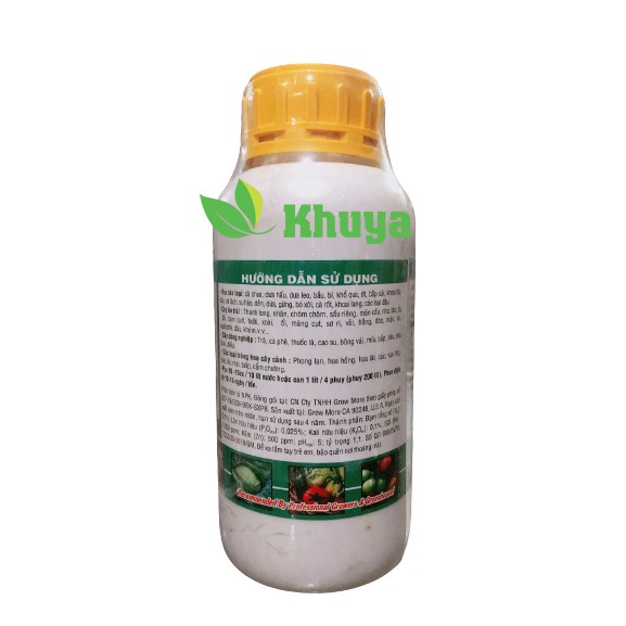 Thành phần: N: 0,1%; P2O5: 0,025%; K2O: 0,1%; Fe: 1000ppm; Zn: 500ppm; pH: 5, tỷ trọng 1,1