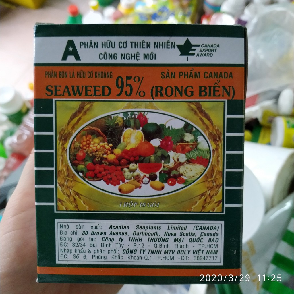 Phân bón rong biển SEAWEED - được sản xuất theo công nghệ mới của Canada.Thành phần: HC: 50%; N: 1,5%; P2O5: 3%; K2O: 20%; S: 1,5%; Mg: 0,45% B: 125ppm; Fe: 200ppm; Mn: 10ppm; Cu: 30ppm; Zn: 65ppm; Cytokinin: 600ppm; Auxin: 37ppm; Gibberellin: 21ppm, Axit Amin (Alanin; Arginin; Threonin; Cystin; Serin; Glycin; Histidin; Valin; Isoleucin; Leucin; Lysin; Prolin; Methionin; Phenylalanin; Tyrosin; Tryptophan; Glutamic amic Axit; Aspartic Axit; Mannitol; Laminarin; Alginic Axit): 5,39%; Độ ẩm: 3-5%