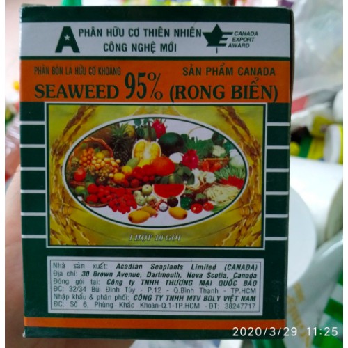 Phân bón rong biển SEAWEED - được sản xuất theo công nghệ mới của Canada.Thành phần: HC: 50%; N: 1,5%; P2O5: 3%; K2O: 20%; S: 1,5%; Mg: 0,45% B: 125ppm; Fe: 200ppm; Mn: 10ppm; Cu: 30ppm; Zn: 65ppm; Cytokinin: 600ppm; Auxin: 37ppm; Gibberellin: 21ppm, Axit Amin (Alanin; Arginin; Threonin; Cystin; Serin; Glycin; Histidin; Valin; Isoleucin; Leucin; Lysin; Prolin; Methionin; Phenylalanin; Tyrosin; Tryptophan; Glutamic amic Axit; Aspartic Axit; Mannitol; Laminarin; Alginic Axit): 5,39%; Độ ẩm: 3-5%