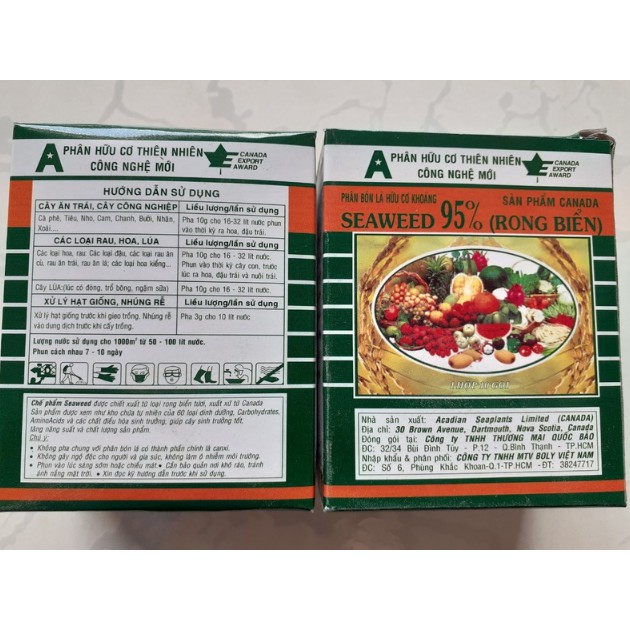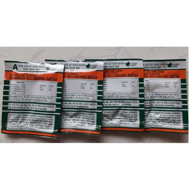 Phân bón rong biển SEAWEED - được sản xuất theo công nghệ mới của Canada.Thành phần: HC: 50%; N: 1,5%; P2O5: 3%; K2O: 20%; S: 1,5%; Mg: 0,45% B: 125ppm; Fe: 200ppm; Mn: 10ppm; Cu: 30ppm; Zn: 65ppm; Cytokinin: 600ppm; Auxin: 37ppm; Gibberellin: 21ppm, Axit Amin (Alanin; Arginin; Threonin; Cystin; Serin; Glycin; Histidin; Valin; Isoleucin; Leucin; Lysin; Prolin; Methionin; Phenylalanin; Tyrosin; Tryptophan; Glutamic amic Axit; Aspartic Axit; Mannitol; Laminarin; Alginic Axit): 5,39%; Độ ẩm: 3-5%