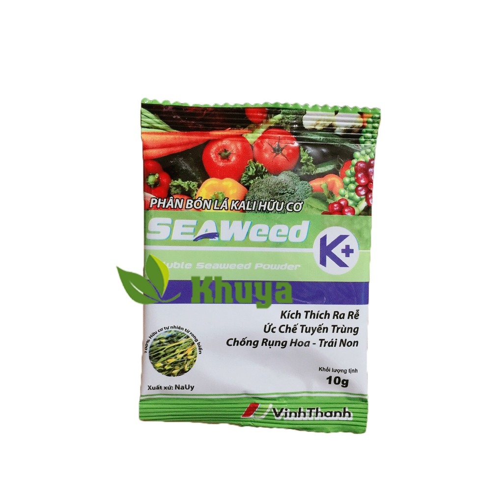 Phân bón lá Kali hữu cơ Seaweed K+ 10gr Kích rễSeaweed k+ là sản phẩm phân bón lá hữu cơ, chứa đầy đủ dinh dưỡng và chất kích thích sinh trưởng cây trồng, tăng khả năng trao đổi chất, hút dinh dưỡng của cây, giúp cây trồng phát triển toàn diện, tăng năng suất và chất lượng nông sản.