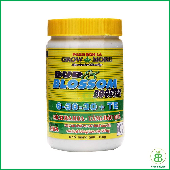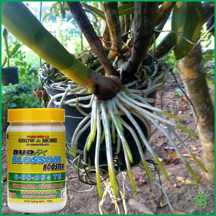- Với thành phần NPK (đạm,lân,kali) 6-30-30 và các nguyên tố trung vi lượng, Growmore thúc cây sinh rễ, phát triển bộ rễ cây. Đồng thời giúp hạn chế cây phát triển sinh dưỡng ( ra lá, nảy chồi), cây chuyển sang giai đoạn sinh sản ( ra nụ đều, đồng loạt)