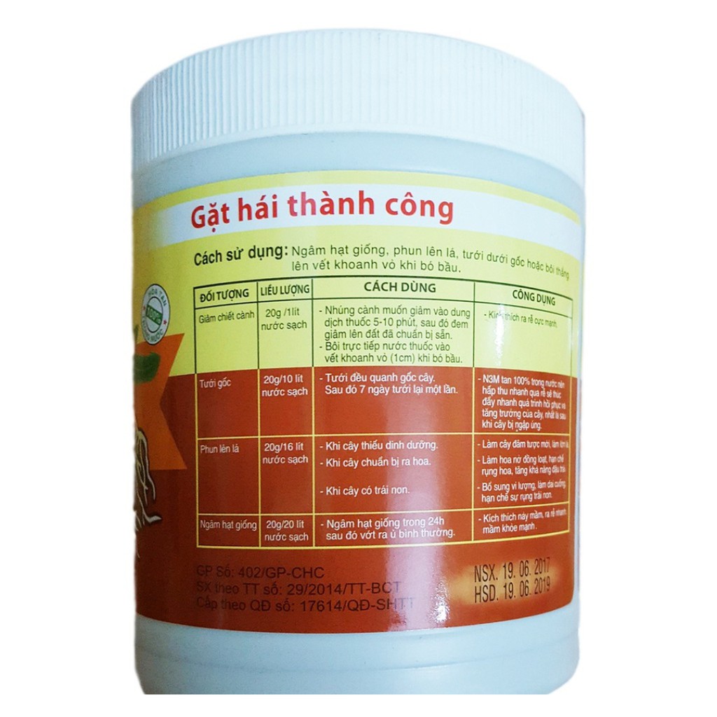 VẬT TƯ NÔNG NGHIỆP CƯỜNG HIỀNCông dụng: Thuốc kích thích ra rễ N3M có tác dụng kích thích nảy mầm của hạt giống; kích thích ra rễ cho cây ăn trái, cây công nghiệp, vườn ươm, cây cảnh… Bên cạnh đó, khi phun lên lá chúng còn có tác dụng giúp cây nhanh đâm tược mới; làm lớn lá; chống rụng hoa, tăng đậu trái. Ngoài ra, nếu cây bị ngập úng có thể dùng N3M như một phương thuốc hữu hiệu đẩy nhanh quá trình hồi phục và tăng trưởng của cây.