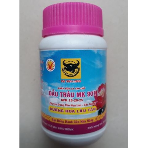 Đầu Trâu 901 (Dưỡng hoa lâu tàn - Hoa đẹp hương thơm)Thành phần: 15% đạm (N), 20% lân (P2O5), 25% kali (K2O), 0,05% magiê (Mg), 0,05% canxi (Ca), 0,02% bo (B), 0,05% kẽm (Zn), 0,05% đồng (Cu), 0,075% sắt (Fe), 0,05% mangan (Mn), 0,005% molypden (Mo), GA3, αNAA, bNOA.