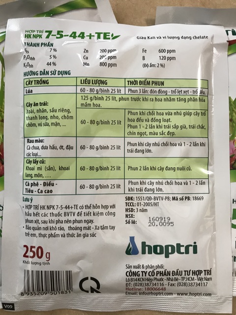 HỢP TRÍ HK 7-5-44+TE có thể hỗn hợp với hầu hết các thuốc BVTV để tiết kiệm công phun xịt, sau khi pha nên phun ngay.