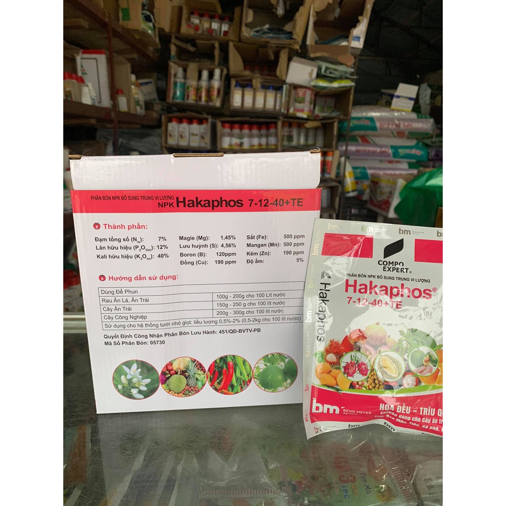 Tên thương mại: Hakaphos 7-12-40 + TEThành phần: đạm: 7%, lân: 12%, kali: 40%, magie: 1,45%, lưu huỳnh: 4,56%, boron: 0,01%, đồng: 0,02%, sắt: 0,05%, mangan: 0,05%, molypden: 0,001%, kẽm: 0,02%.