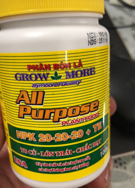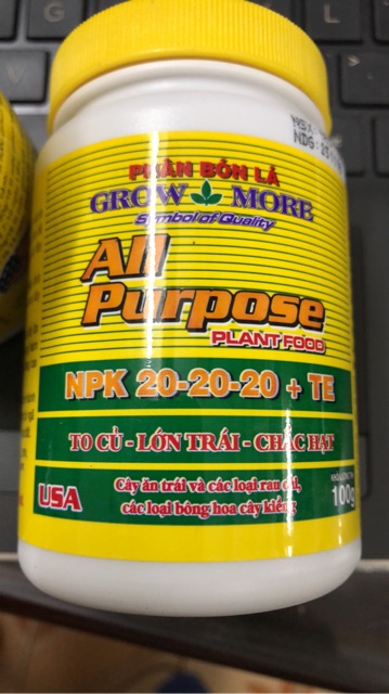 Nhà cửa & Đời sống > Làm vườn > Phân bón || ☘ PHÂN Bón lá NPK GROW MORE 20-20-20 TE (hũ 100gr)Còn hàng