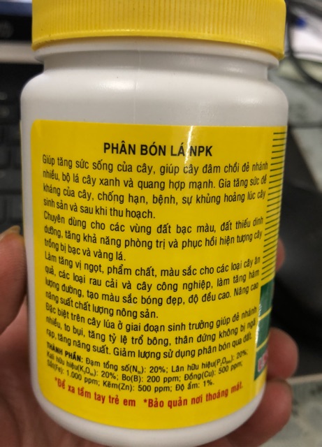 N 20%, P2O5 20%, K20 20% + TE (các nguyên tố đa trung vi lượng khác như Ca, Mg, S, B, Fe, Zn, Cu...)